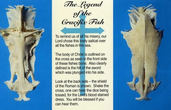 Another animal with an interesting connection to the cross is the Gafftopsail Catfish. I used to have one of these, but it broke when I moved back home with my parents. If you shook it gently, you literally could hear what sounded like dice being shaken. It was very cool.