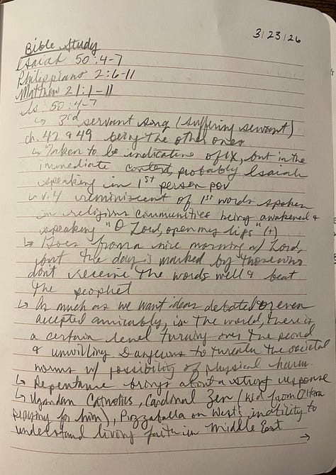 Disclaimer: Since my note-taking is somewhat erratic and illegible, I’ll add any information that I may have missed or mistranscribed during the meeting. Please keep in mind that this is not intended to be a comprehensive study that examines every possible aspect of the readings and tells you what is most important. Instead, these are just points that made an impact on me, or as a group, we explored. Think of these notes as adding to your background knowledge of the passages, so when you go to pray with them, something new may distinguish itself that did not before.